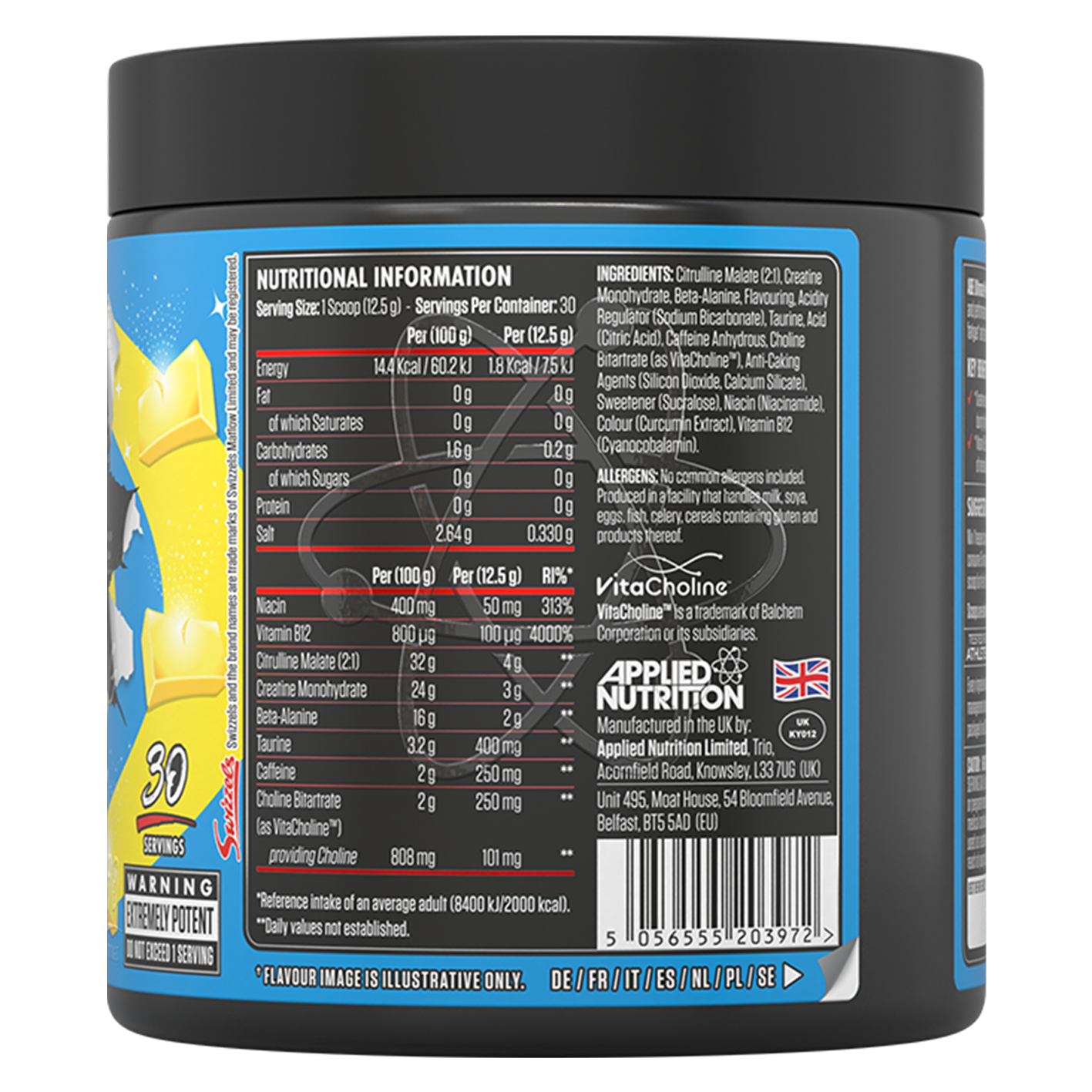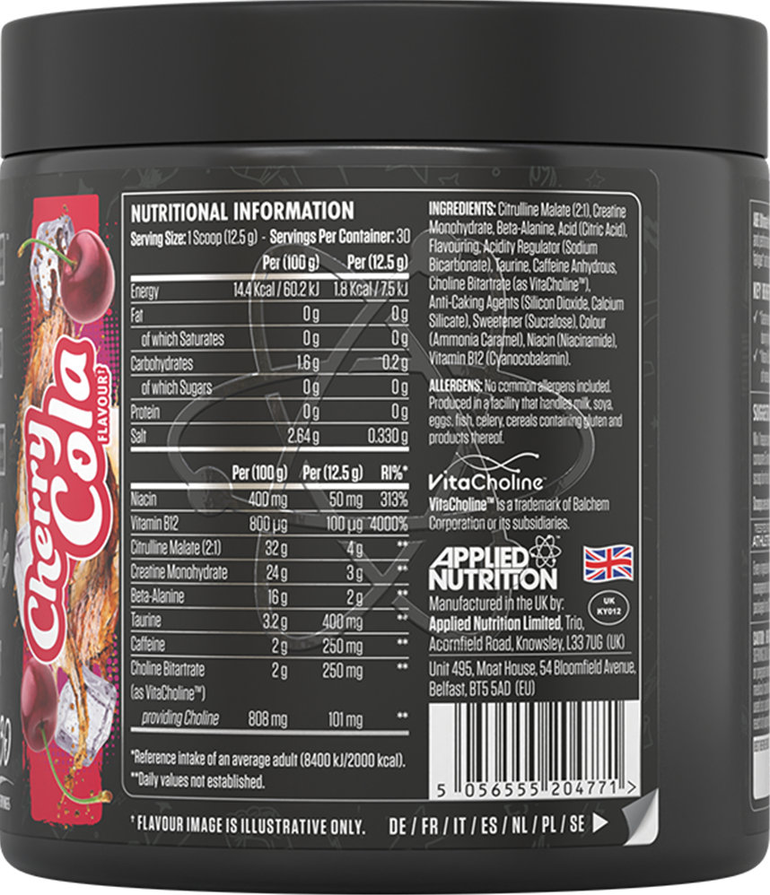 Zutaten: Citrullin Malat 2:1, Kreatinmonohydrat, Beta-Alanin, Natriumbicrbonat, Säure (Zitronensäure), Siliciumndioxid, Kalziumsilikat, Taurin, Koffein wasserfrei, Farbstoff (Karamel Extrakt), Süßungsmittel (Sucralose), Nikotinamid (Vitamin B3), Vitamin B12 (Cyanocobalamin).