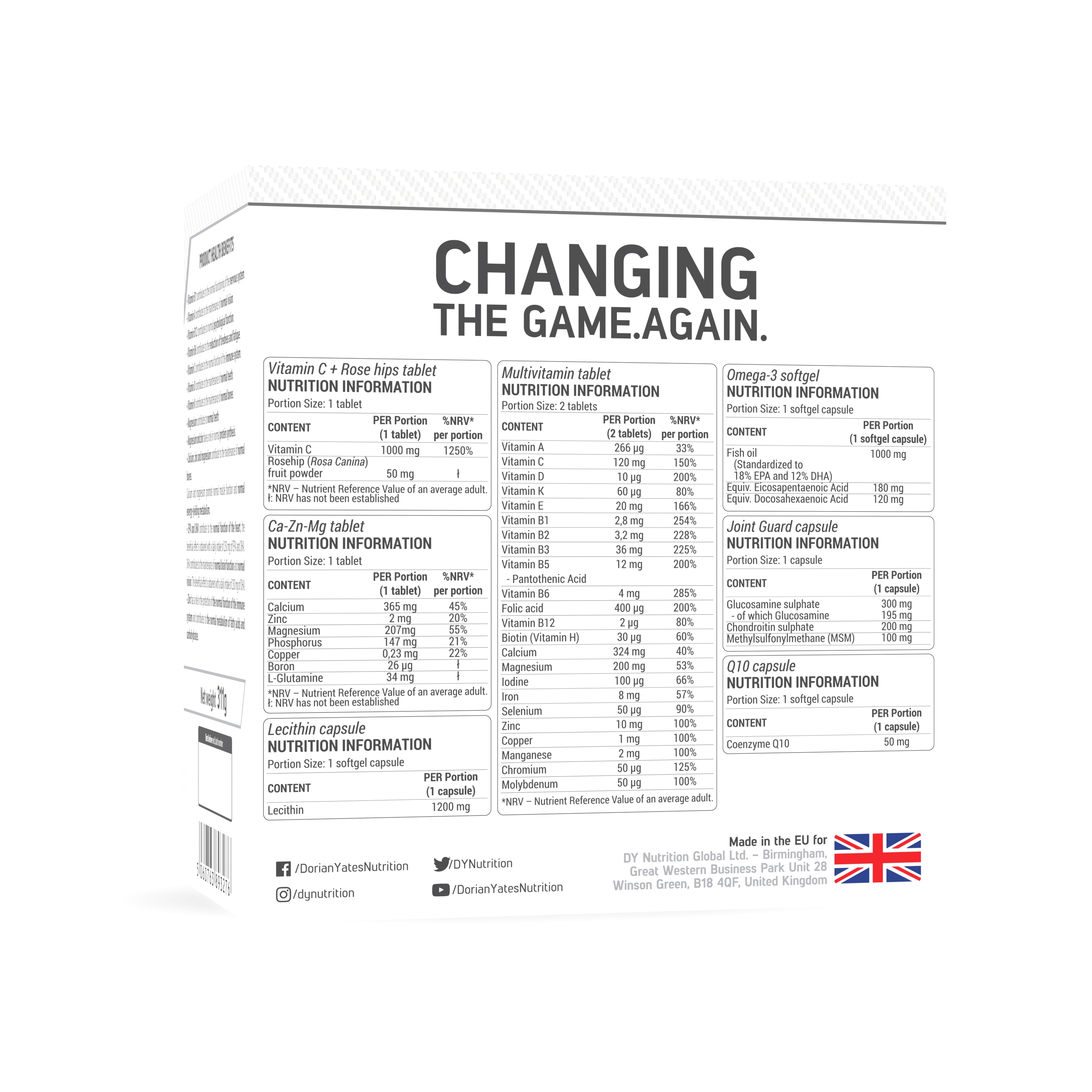Zutaten: Vitamine, Mineralstoffe, Omega-3-Fettsäuren, Lecithin und Coenzym Q10 enthaltendes Nahrungsergänzungsmittel Vitamin C + Hagebutten Tablette: L-Ascorbinsäure, Füllstoff (Cellulose), Trennmittel (Magnesiumsalze der Fettsäuren, Talk, Siliciumdioxid, Calciumsalze der Orthophosphorsäure), Stabilisator (Polyvinylpyrolidon (PVP), Hagebutten (Rosa canina) Fruchtpulver, Feuchthaltemittel (Sorbit), Stabilisator (Hydroxypropyl Methylcellulose). Ca-Zn-Mg Tablette: Calciumsalze der Orthophosphorsäure, Magnesiumoxid, Calciumcarbonat, Füllstoff (Cellulose), Trennmittel [Siliciumdioxid, Talkum, Magnesiumsalze von Speisefettsäuren], L-Glutamin, Stabilisator [Polyvinylpyrrolidon [PVP], Zinkcitrat, Kupfersulfat, Borsäure] Lecithin Softgel: Lecithin (aus Sojabohnenöl, Kapsel [Gelatine, Feuchthaltemittel (Glycerin, gereinigtes Wasser). Multivitamin Tablette: Calciumsalze der Orthophosphorsäure, Füllstoffe (Cellulose, Maltodextrin), Magnesiumoxid, L-Ascorbinsäure, DL-alpha-Tocopherylacetat, Nicotinamid, Trennmittel [Talkum, Siliciumdioxid, Magnesiumsalze von Speisefettsäuren, Eisenfumarat, D-Pantothenat, Calcium, Zinkoxid, Jodfüllstoff, Natriummolybdat, Natriumselenit, D-Biotin]. Omega-3 Softgel: Fischöl (standardisiert auf 18% EPA und 12% DHA), Kapsel [Gelatine, Feuchthaltemittel (Glycerin), gereinigtes Wasser, Antioxidans (Tocopherole). Joint Guard Kapsel: Maltodextrin, Glucosaminsulfat [aus Schalentieren], Chondroitinsulfat, Kapselhülle [Gelatine, Farbstoff (Titandioxid)], Methylsulfonylmethan [MSM], Antibackmittel (Siliziumdioxid, Calciumsalze der Orthophosphorsäure), L-Ascorbinsäure Q10 Softgel: Füllstoffe (Sojabohnenöl, Sojabohnen-Ecithinl, Kapsel (Gelatinel, Coenzym CHO, Feuchthaltemittel (Glyceroll, gereinigtes Wasser, Farbstoff (Titandioxidel, Antioxidationsmittel Tocopherole)
