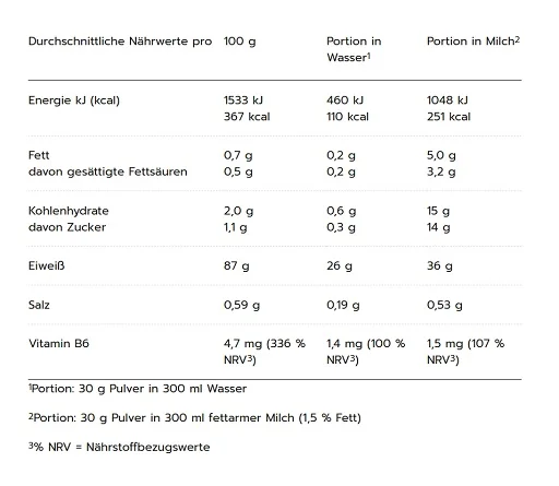 Zutaten: Erdbeere: Molkenproteinisolat (95,7 %), Erdbeerpulver gefriergetrocknet (2 %), natürliches Aroma, Emulgator Lecithine (Sonnenblume), Maltodextrin, Rote Bete Saft Konzentrat, Süßungsmittel Acesulfam K, Süßungsmittel Natriumsaccharin, Vitamin B6, Säureregulator Citronensäure. Kaffee: Molkenproteinisolat (95 %), löslicher Bohnenkaffee (3 %), natürliche Kaffeearomen, Emulgator Lecithine , Süßungsmittel: Acesulfam K, Natriumsaccharin; Vitamin B6 (Pyridoxinhydrochlorid). Kokos: Molkenproteinisolat (93 %), Kokosnussraspeln (5 %), natürliches Aroma, Emulgator Lecithine , Süßungsmittel: Acesulfam K, Natriumsaccharin; Vitamin B6 (Pyridoxinhydrochlorid).
