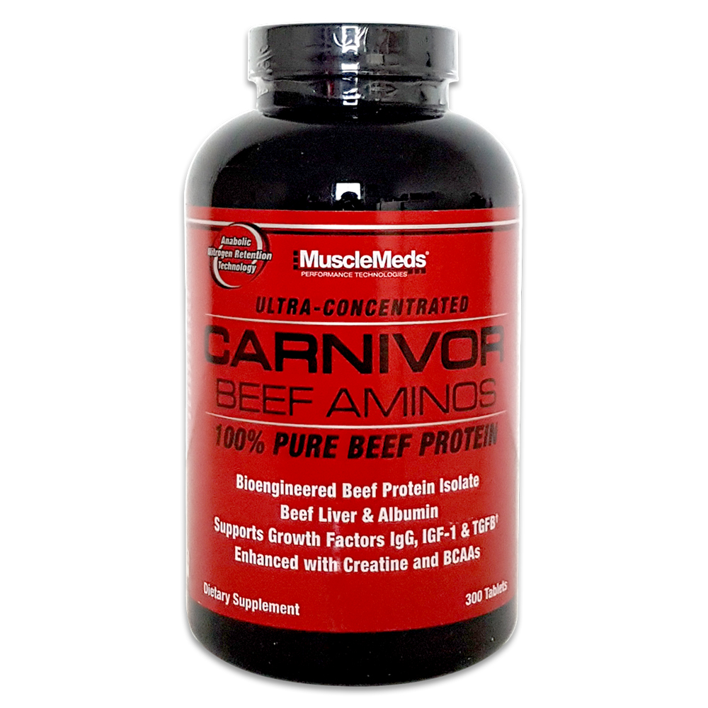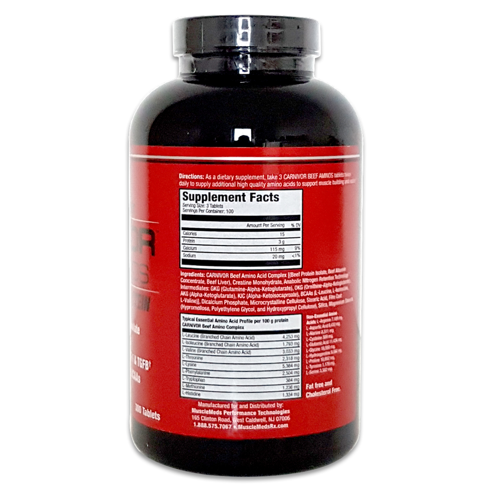 MuscleMeds Ultra-konzentrierte Carnivor 100% Beef Aminos verwenden eine patentierte Verarbeitungstechnologie, um hohe Konzentrationen an hochwertigen Aminosäuren bereitzustellen. Hergestellt aus feinstem Premium-Rindfleischproteinisolat, Rinderalbumin und Rinderleber, bietet jede hochkonzentrierte Tablette ein vollständiges Spektrum an essentiellen Aminosäuren, einschließlich eines hohen Gehalts an verzweigtkettigen Aminosäuren (BCAA) und bioaktiven Wachstumsfaktoren. Darüber hinaus hilft die Zugabe von Kreatin, die Muskelgröße und -kraft zu erhöhen. Diese wirksame Aminosäureformel ermöglicht es Ihnen, die muskelaufbauende Kraft von Rindfleisch ohne Fett oder Cholesterin und mit noch höheren Konzentrationen an Aminosäuren, Kreatin und Wachstumsfaktoren zu nutzen.