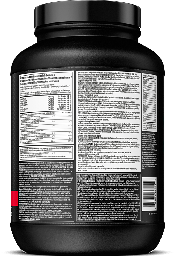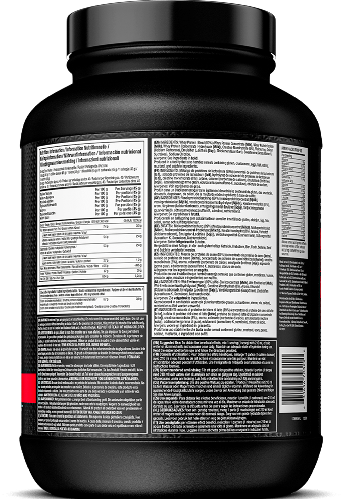 Zutaten: Molkeproteinmischung (88%), (Molkeproteinkonzentrat (Milch), Molkeproteinisolat (Milch), Molkeproteinkonzentrat-Hydrolisat (Milch), Kreatinmonohydrat (7%), Aroma, Trennmittel (Calciumcarbonat), Emulgator (Lecithine (Soja)), Verdickungsmittel (Xanthan, Guarkernmehl), Farbstoff (Betanin (Betenrot)), Säureregulatoren (Apfelsäure, Citronensäure), Süßungsmittel (Acesulfam K, Sucralose).