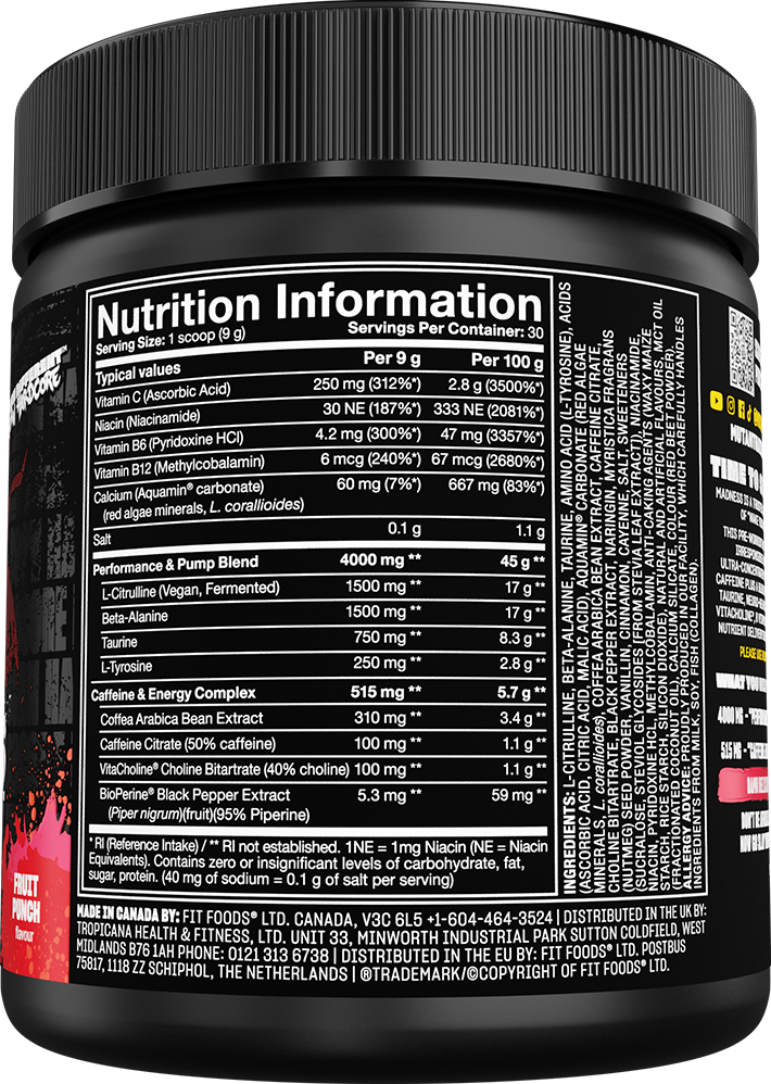 Zutaten: L-Citrullin, Beta Alanin, Taurin, Aminosäuren (L-Tyrosin), Säuerungsmittel (Apfelsäure, Citronensäure), Aquamin-Karbonat)(Rotalgenmineralien, L. corallioides), Coffea Arabica Bohnen Extrakt, Koffeincitrat, Cholin Bitartrat, Schwarzer Pfeffer Extrakt, Naringin, Myristica fragrans, (Muskat-)Samenpulver, Vanillin, Zimt, Cayennepfeffer, Salz, Süßungsmittel (Sucralose, Steviol Glycosides (Steviablatt Extrakt)), Niacinamid, Niagin, Pyridoxin HCl, Methylcobalamin, Trennmittel (Wachsmaisstärke, Siliciumdioxid),Natürliche und künstliche Aromen, MCT-Öl (fraktioniertes Kokosöl), Calciumsilikat, Farbstoffe (Rote-Bete-Pulver, Beta-Carotin).