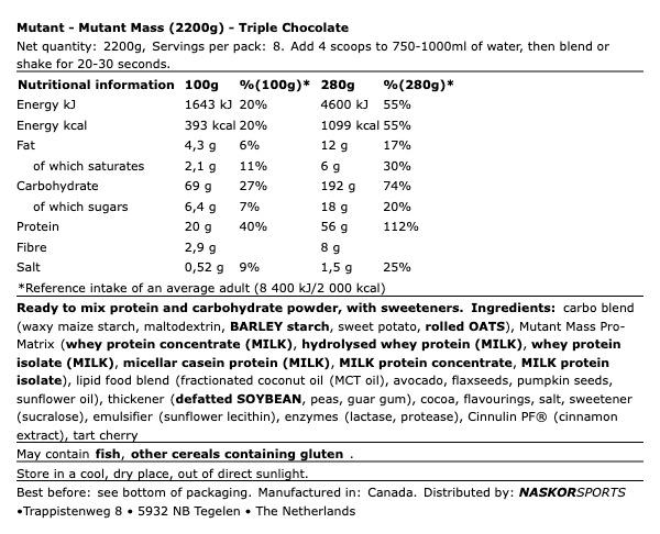 Zutaten: Kohlenhydratmischung (Wachsmaisstärke, Maltodextrin, Gerstenstärke, Süßkartoffel, Haferflocken), Mutant Mass Pro Matrix (Molkenproteinkonzentrat, Hydrolisiertes Molkenprotein, Molkenproteinisolat, Mizellares Kaseinprotein, Milchproteinkonzentrat, Milchprotein Isolat), Speisefettmischung(Fraktioniertes Kokosnuss Öl (MCT Öl), Avocado, Leinsamen, Kürbissamen, Sonnenblumen Öl), Verdickungsmittel (entfettete Sojabohnen, Erbsen, Guarkernmehl), Kakao, natürliche und künstliche Aromen, Salz, Süßungsmittel (Sucralose1 [480 mg]), Emulgator (Sonnenblumenlecithin), Enzyme (Laktase, Protease), Cinnulin PF® (Zimtextrakt), Sauerkirsche
