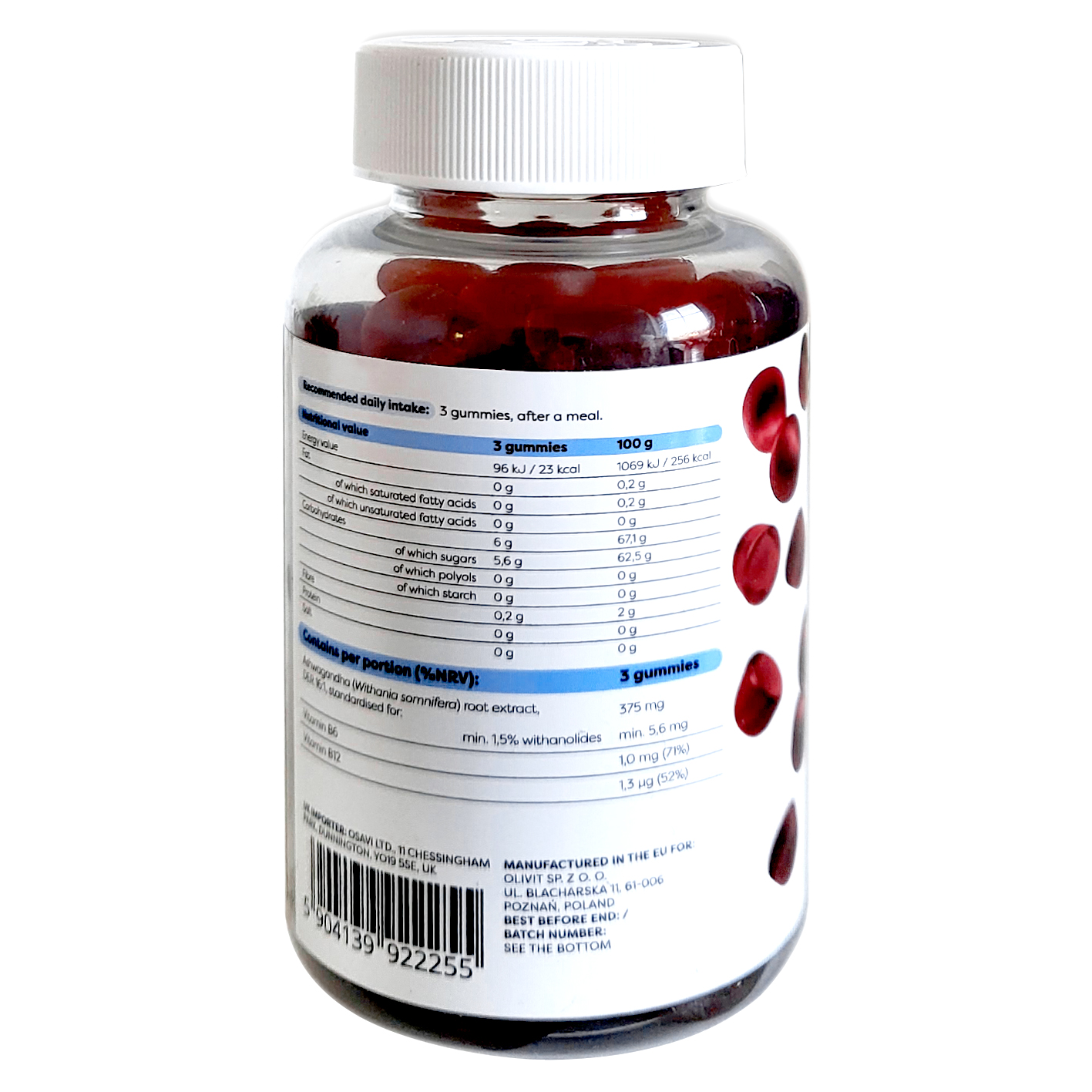 Inhalt: 90 Gummies, Portionsgröße: 3 Gummibären (375 mg Ashwagandha), Portionen pro Packung: 30
