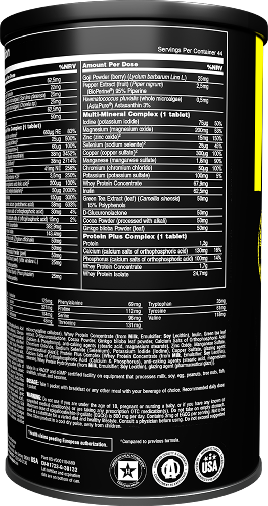 Durch Tablettenform von Animal Pak 44 ist eine unkomplizierte und einfache Einnahme möglich. Es enthält nicht nur Vitamin C und eine vollständige Palette an Multivitaminen und Mineralstoffen, sondern auch spezielle Verdauungsenzyme, die die Nährstoffaufnahme optimieren. Der enthaltene Leistungskomplex unterstützt zusätzlich die Energieproduktion, allgemeine Gesundheit, Erholung und verbessert die Leistungsfähigkeit bei intensiven Trainingseinheiten.